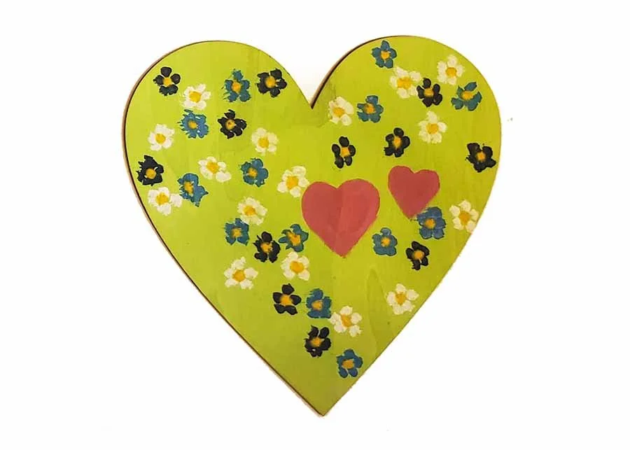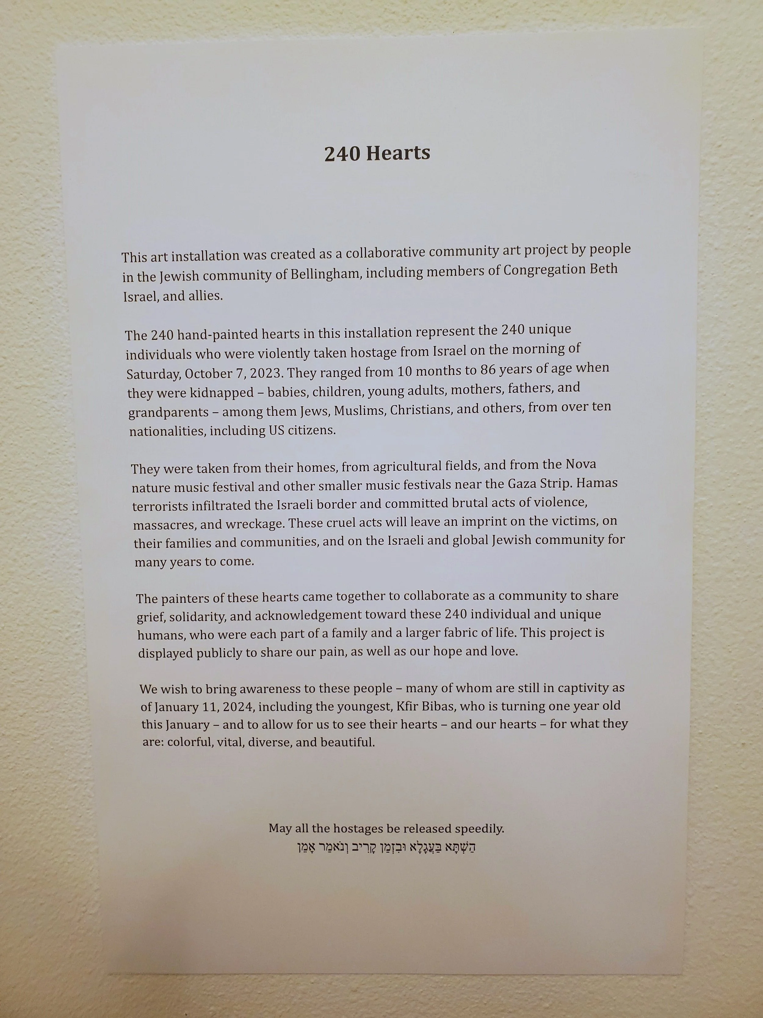 Hand-painted hearts created collaboratively and displayed in Bellingham, WA, after Oct. 7th, 2023 by members of the Jewish community of Bellingham, WA, and Congregation Beth Israel. (*At the beginning it was 240 because that was the original estimated number of hostages before it rose to 250+). Now available as prints or as folded greeting cards.